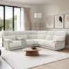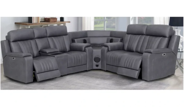 A “cinematic” type designed suite with built in speakers for immersive sound. Drop-down tray in the sofa and console in the loveseat provide ample space for snacks and drinks with integrated wireless chargers.