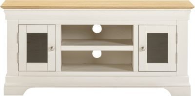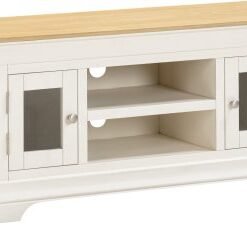 OAK, HARDWOOD, PLYWOOD BACK PANEL, METAL HANDLES, GLASS, PLASTIC FEET
