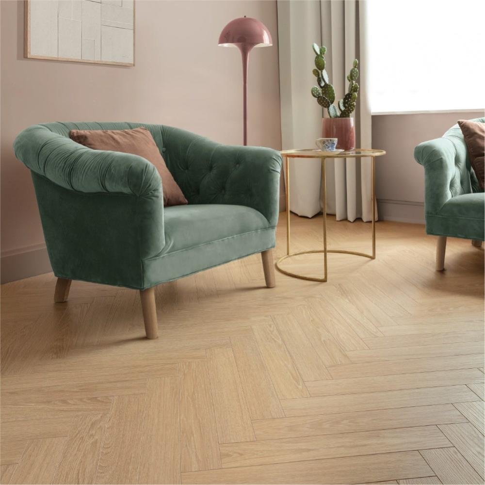 The light natural wood-effect finish creates a fresh and welcoming atmosphere, enhancing both contemporary and traditional interiors. The classic herringbone format (504mm x 84mm planks) adds depth and sophistication, instantly elevating living rooms, hallways and open-plan spaces.