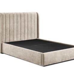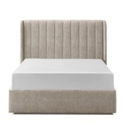The Frida gas lift storage bed comes in a plush grey or beige fabric upholstery and an elegant wingback headboard adorned with stylish vertical lines.