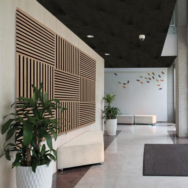 Sound absorbing wall panels. Certified NRC (Noise Reduction Coefficient) value of 0.8 – 80% of the sound energy that contacts the panels is absorbed.