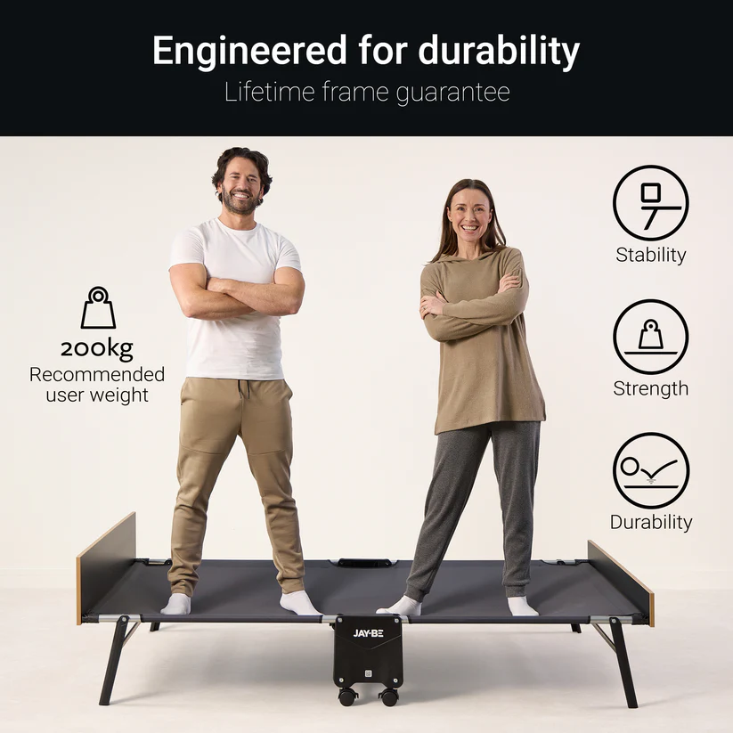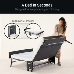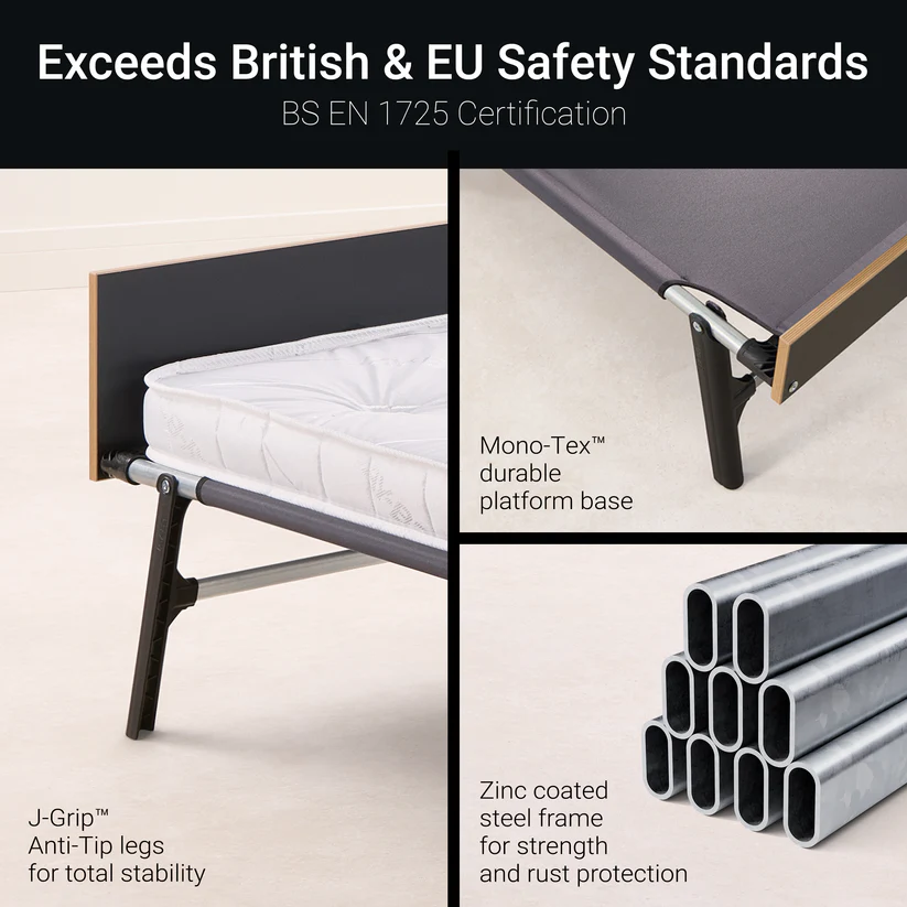Built with a robust steel frame and a supportive Mono-Tex platform base, this folding bed offers long-lasting durability and stability. The addition of J-Grip anti-tip legs and 8-point floor contact ensures a secure and steady sleeping surface every time it is in use.