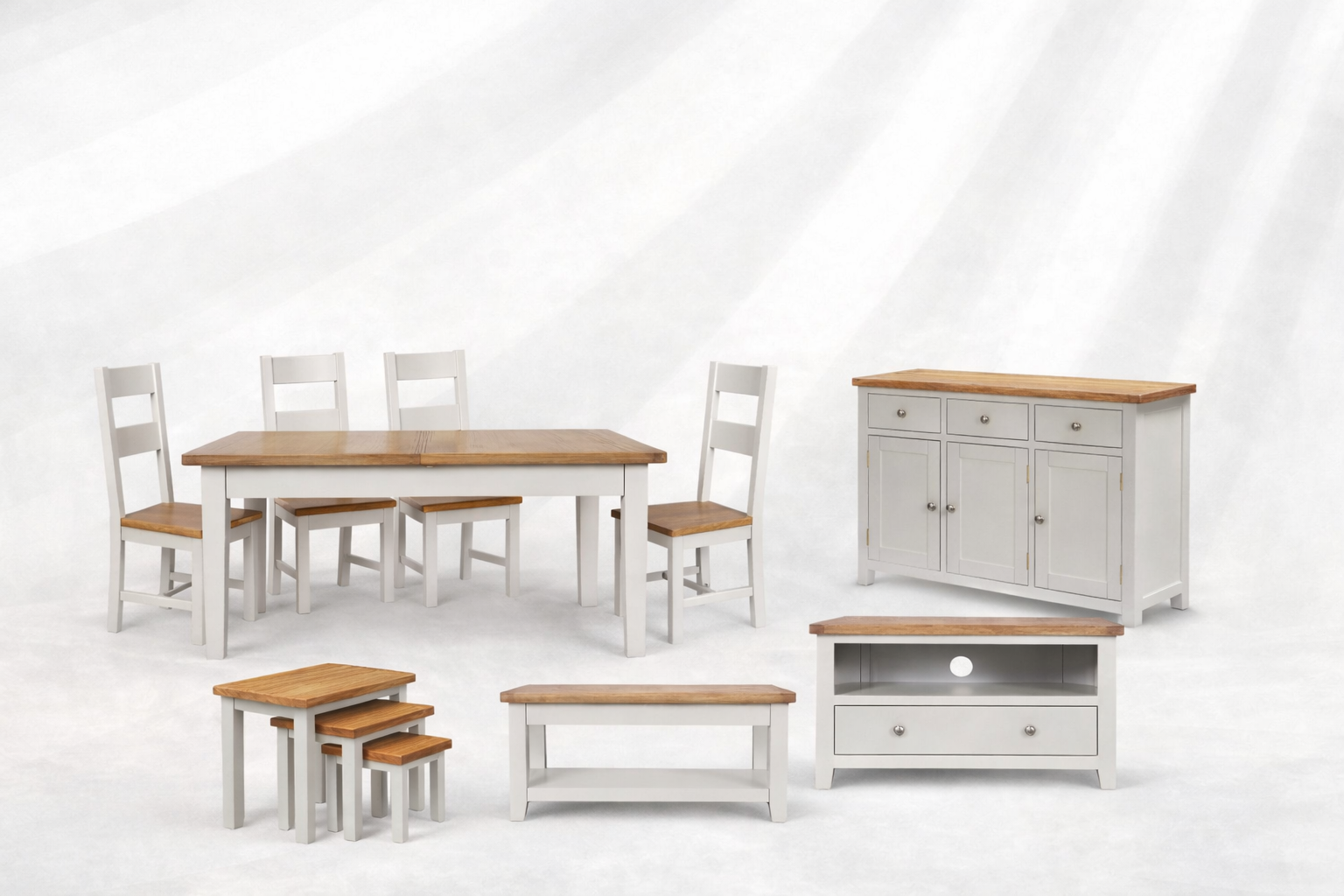Upgrade your home with the stylish and practical Melbourne Package Deal, a beautifully coordinated furniture collection finished in oak and painted white with elegant satin knobs. Designed to bring warmth and timeless character to your dining and living space, this package combines classic craftsmanship with everyday functionality.