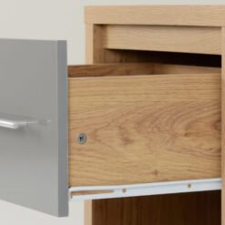 Designed to complement both modern and traditional interiors, this bedside cabinet features a sleek grey high-gloss drawer front paired with a warm light oak effect frame, creating a contemporary and balanced look.