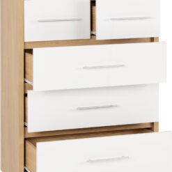 The Seville 3+2 Drawer Chest combines modern design, durability and everyday practicality, making it a stylish addition to any contemporary home. White High Gloss/Light Oak Effect Veneer