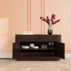 The Transformer Round Sideboard – Panel Storage is a modern, elegant storage solution designed to elevate your dining or living space. Featuring a sleek curved profile, this round wood sideboard offers hidden drawers, cabinets, and integrated table panel storage — all concealed behind stylish vertical sliding panels. Whether you’re storing dinnerware, glassware, or hosting essentials, this sideboard keeps your space organized without sacrificing sophisticated design.