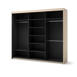 Inside, the wardrobe includes eight shelves and three hanging rails, offering flexible storage for clothing, shoes and accessories. Integrated LED lighting enhances visibility and adds a premium finish.