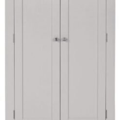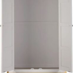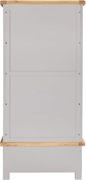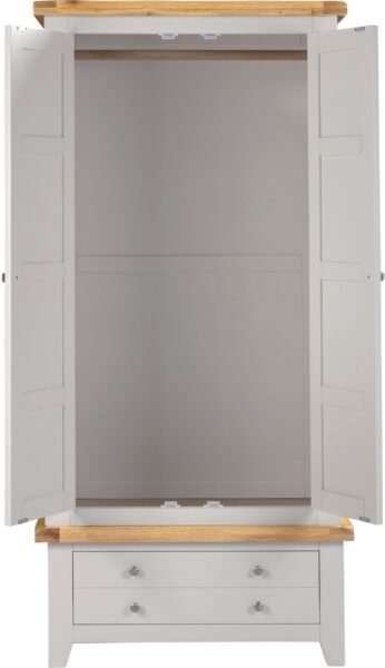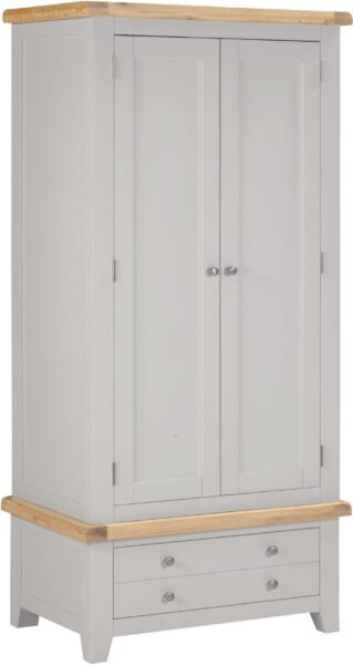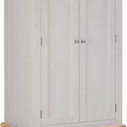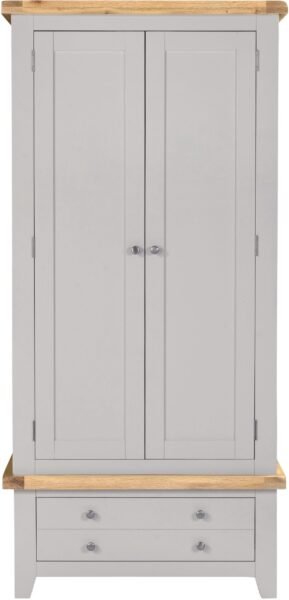Featuring a soft pebble grey finish paired with natural oak detailing, this wardrobe offers a contemporary yet classic look that suits both modern and traditional interiors. Its compact two-door design makes it ideal for smaller spaces while still providing generous hanging and drawer storage.